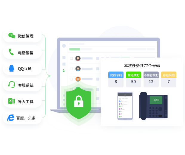EC连接微信、QQ、电话、邮件等多种社交工具,可将社交平台上的所有客户信息和数据一键导入系统,沉淀为企业的数字资产。并且在客户资料界面上直接点击就能发起QQ、电话、邮件、微信等不同方式联络客户,通过EC智能电销的功能通道,每通电话实时录音,通过录音既可考核客服回访质量,避免纠纷,也能总结优秀话术,提高整个团队的销售水平。
